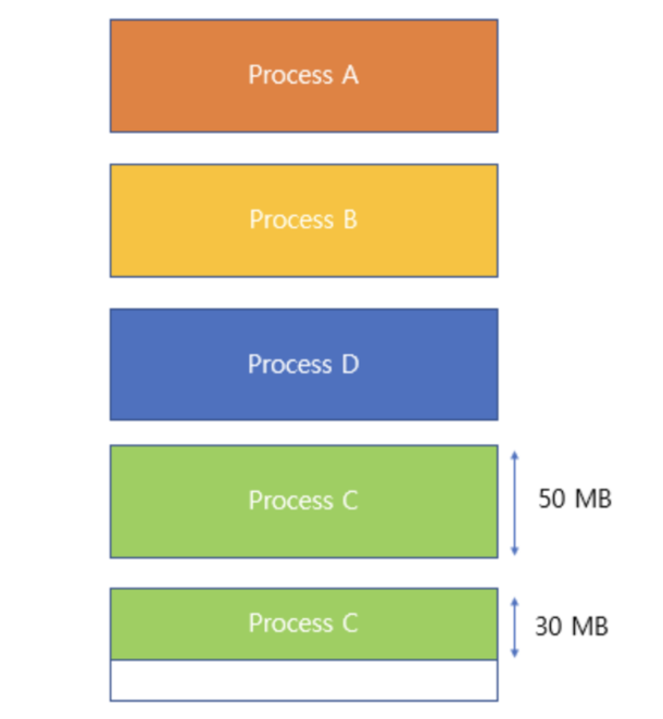 요청 메모리를 적재하게 되면 (100MB - 80MB)인 20MB가 남게 된다. 남은 20MB는 사용되지 않는 메모리가 되는데, 이를 20MB만큼 내부 단편화가 발생했다고 한다.