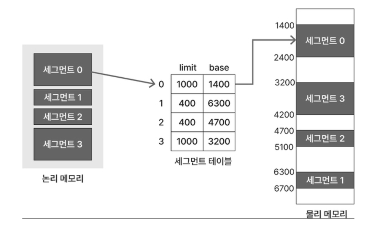 프로세스를 쪼갠 세그먼트를 물리 메모리에 적재하기 위해서 세그먼트 테이블을 사용한다. 세그먼트 테이블은 (base, limit)으로 매핑하여 기록하고 있다.