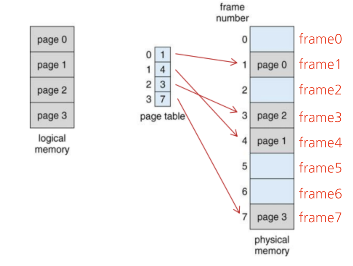 아래 사진을 보면 프로세스를 일정한 크기로 나누어 4개의 페이지가 만들어졌고, 각 페이지를 프레임에 불연속적으로 배치하였다. 페이지를 물리 메모리에 불연속적으로 배치할 수 있는 이유는 페이지 테이블(Page Table)을 사용하기 때문이다. 페이지 테이블에는 (페이지 번호, 프레임 번호) 단위로 저장하고 있으며 특정 페이지가 어느 프레임에 저장되어 있는지 기록한다.