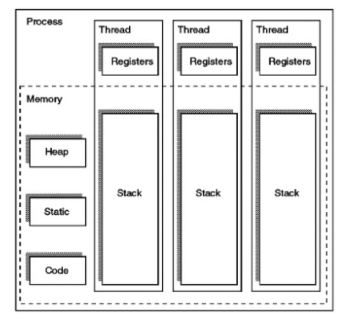 - 같은 프로세스 내의 모든 스레드는 힙(Heap), 데이터(Data), 코드(Code) 영역을 공유한다.