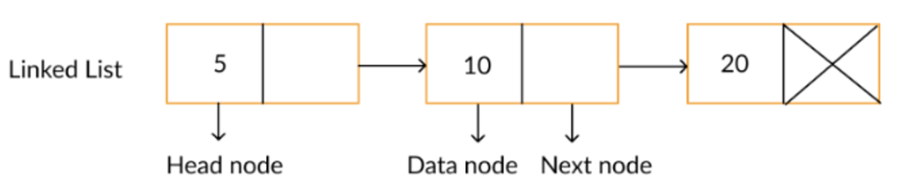 배열과 달리 메모리를 연속적으로 사용하지 않기 때문에 포인터를 사용하여 노드들을 서로 가리킨다. 이는 순차적으로 데이터를 탐색해야 하나, 데이터 삽입 및 삭제 시에는 배열에 비해 유리하다.