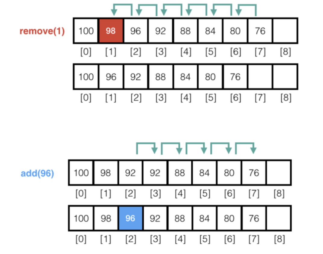 전자의 경우 삽입될 메모리의 영역을 알고 있기 때문에 바로 삽입할 수 있다. 후자의 경우 특정 위치에 데이터를 삽입하게 되면 삽입된 지점 이후의 데이터를 뒤로 복사하여 이동시켜야 한다.