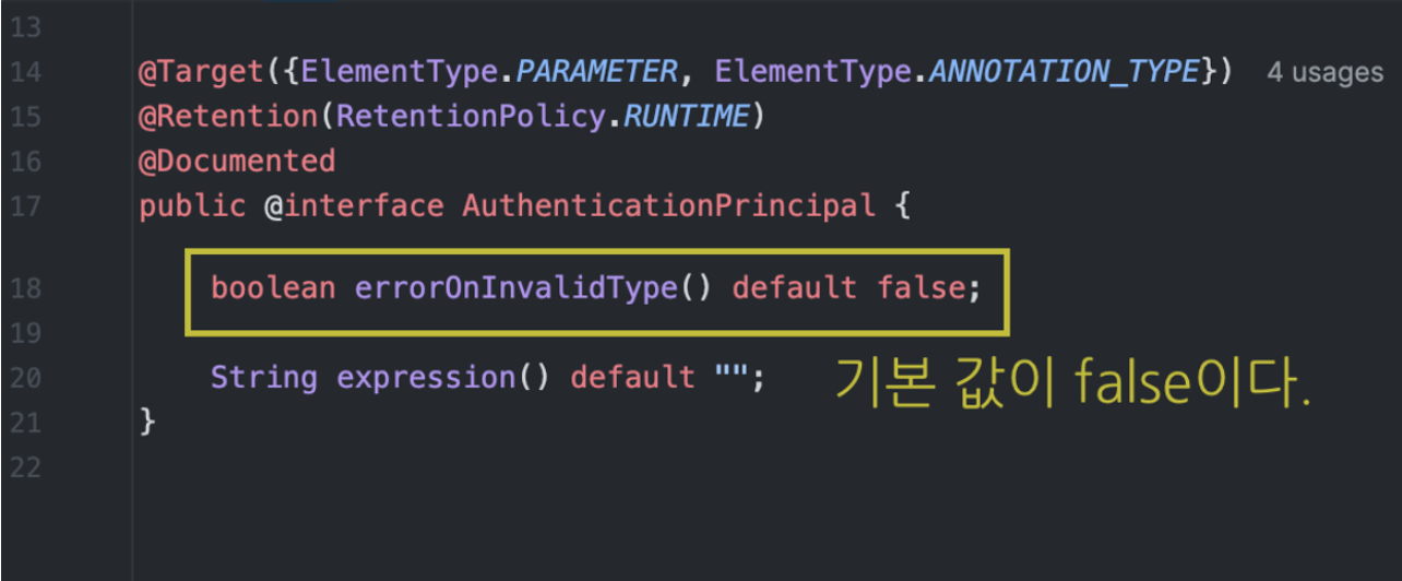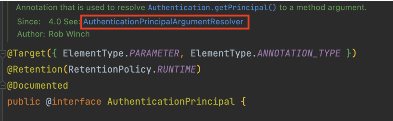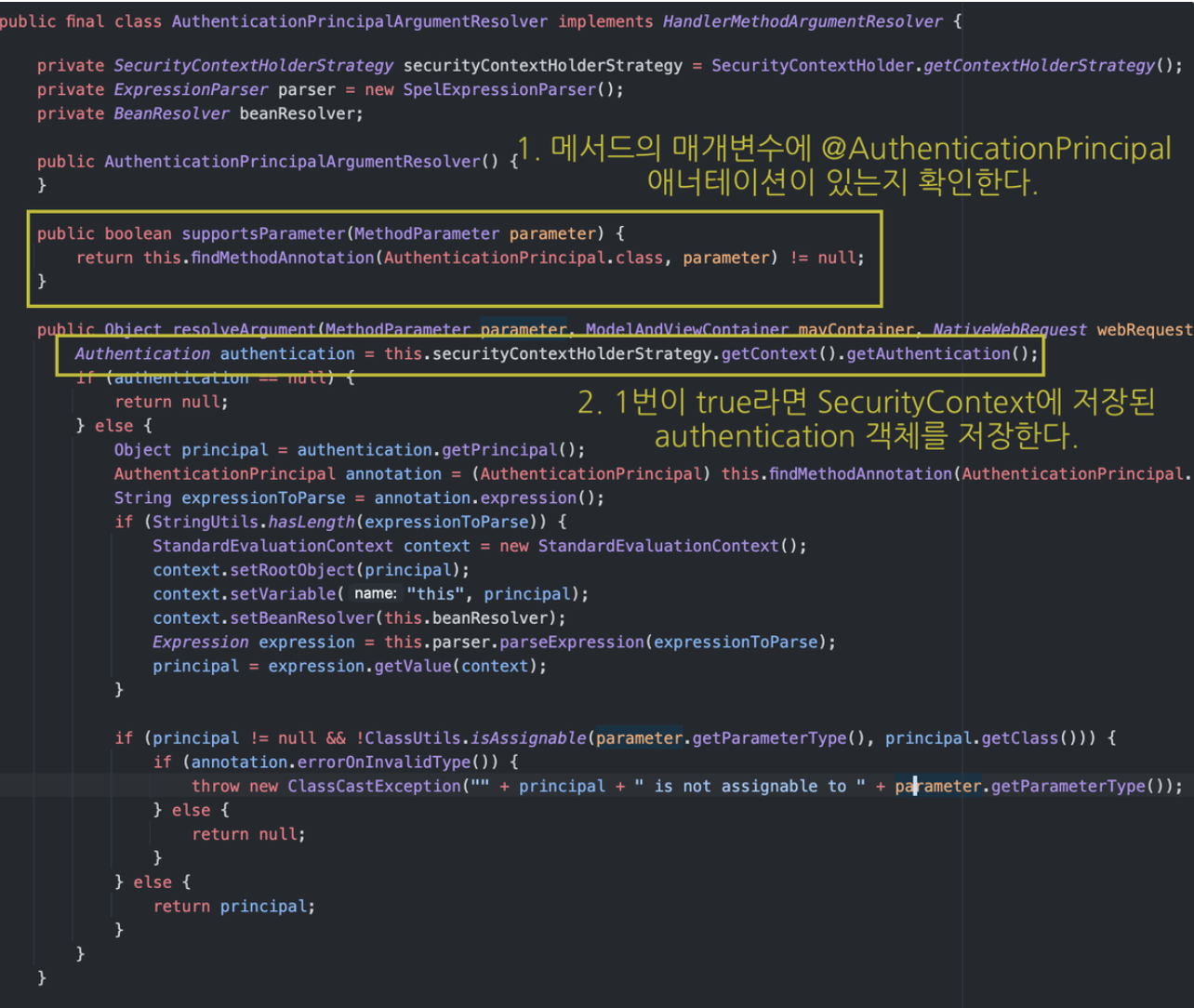 이 애너테이션은 AuthenticationPrincipalArgumentResolver을 사용함을 알 수 있다.