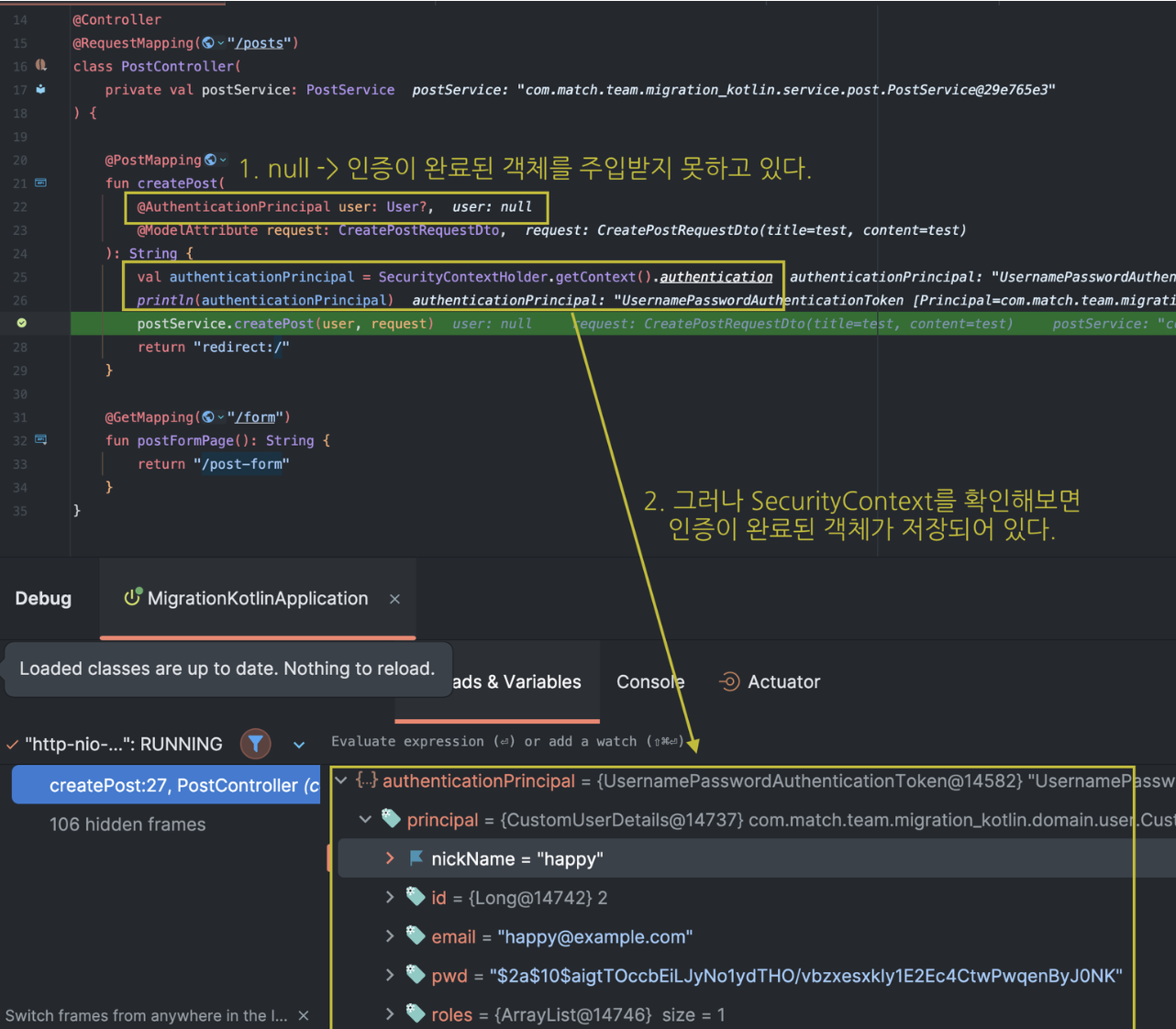 2번에서 설명했듯이, User 객체가 @AuthenticationPrincipal를 사용하여 인증된 객체를 주입 받고자 했으나 null이 저장된다. null이 저장된 것이 맞는지 의심이 된다면 위의 그림1을 보자.