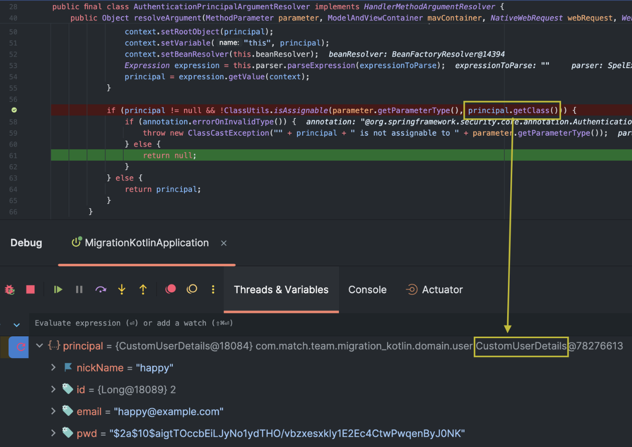 그림4와 그림5를 보면 parameter와 principal의 클래스 타입이 다른 것을 알 수 있다.