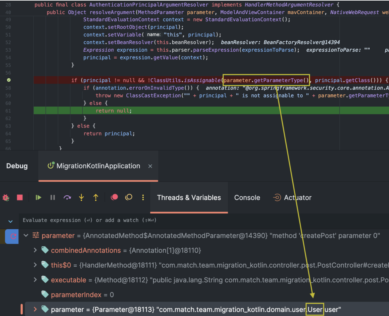 createPost()의 매개변수로 @AuthenticationPrincipal user: User? 가 사용되기 때문에 1번은 true를 반환한다. 1번이 true를 반환하기 resolveArgument() 메서드가 호출된다.