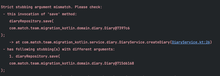 그렇다면 diary 객체를 스터빙에 사용하면 어떻게 될까? 테스트 코드에서 사용한 diary 객체와 서비스 레이어에서 생성한 diary 객체가 서로 다른 객체이므로 객체가 일치하지 않는 오류가 발생한다.