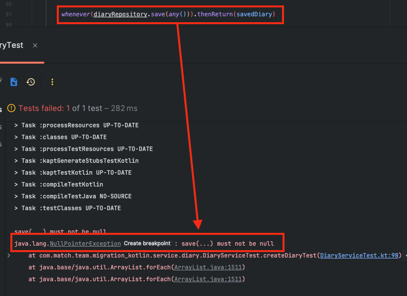 org.mockito.kotlin.any 패키지를 사용하여 스터빙을 한다면 save()에 null을 허용하지 않게 된다. 그러나 실제 테스트 코드에서 null을 매개변수 인자로 사용하게 되면 스터빙 설정을 찾지 못하게 된다. 따라서 다음 오류가 발생하는 것이다.