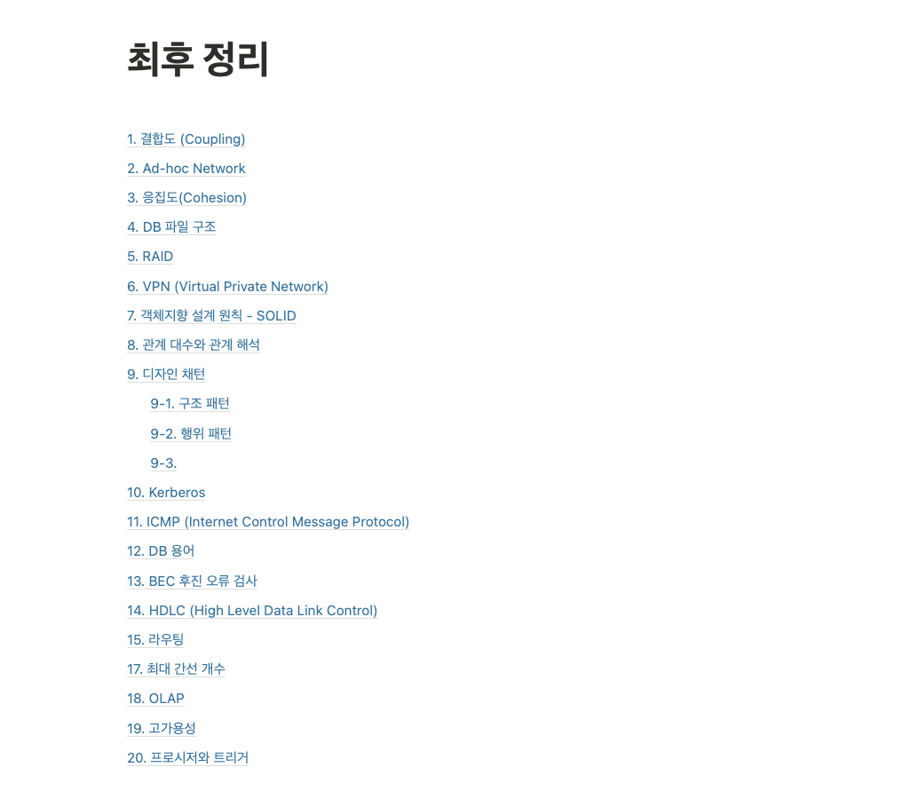 시험을 치러 가는 지하철에서 사진에 있는 내용을 반복해서 읽었고, 이번 2회 차 시험에서 결합도, 응집도, VPN, 디자인 패턴, 라우팅이 나왔습니다. 정리한 내용이 있었기 때문에 5문제를 맞을 수 있었다고 생각합니다. 본인이 이해가 되지 않는 부분이라던가 불안한 부분이 있다면 반드시 정리해야 합니다.