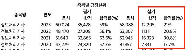 정보처리기사 실기의 경우 합격률이 대략 20~30% 정도 된다고 합니다. 22, 23년도의 경우 20프로를 웃돌고 있기 때문에 비전공자와 전공자 모두에게 쉽지 않은 시험이라고 생각됩니다. 그러나 시작 전부터 불안해하는 것보단 일단 마음먹고 열심히 공부하면 충분히 합격할 수 있을 것이라 생각합니다.