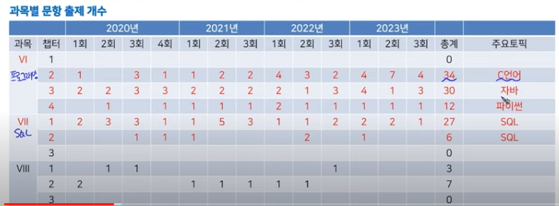 따라서 정보처리기사가 개정된 20년도부터 출제 경향을 아는 것이 중요합니다. 아래 사진을 보면 알 수 있듯이 나오는 문제들은 한정되어 있습니다. 특히나 프로그래밍(자바, C언어, 파이썬)에서 상당수를 차지하고 있고, 각 회차당 대략 10문제가 출제됩니다. 실기의 경우 총 20문제가 출제되고 100점 만점입니다. 여기서 프로그래밍이 절반을 차지하고 있다는 말이 됩니다. 또한 제가 이번에 시험 친 2회 차의 경우 SQL을 포함한 프로그래밍의 경우 10문제가 출제되었습니다. 실기의 경우 60점을 넘기면 합격이 되는데 10문제를 다 맞추면 50점이 되고 남은 2문제만 맞추더라도 합격이 됩니다. 즉, 프로그래밍 문제만 다 맞아도 거의 합격이라는 말이 됩니다.