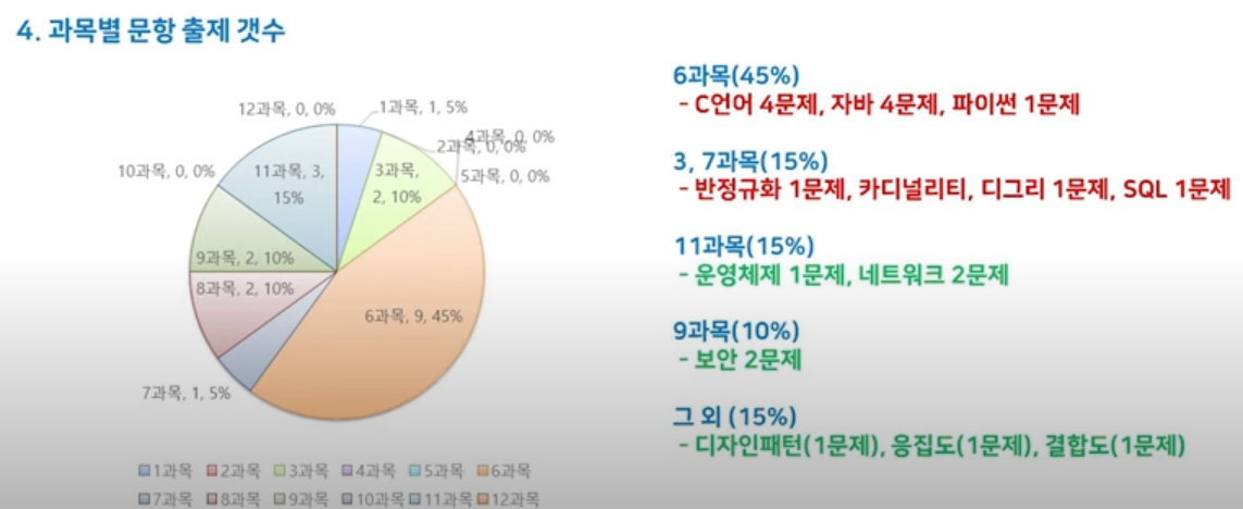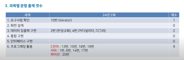 따라서 12개의 과목에 대해서 완벽하게 공부하는 것보단 프로그래밍을 완벽하게 공부하시는 것을 추천드립니다. 위에서 말했다시피 24년도 2회 차의 경우 프로그래밍 문제가 대략 10문제가 출제되었습니다. 프로그래밍을 먼저 완벽하게 끝내시고 나서 소프트웨어 구축 및 테스트 방법, 네트워크, 운영체제 위주로 공부하시면 충분히 합격할 수 있을 것이라 생각합니다.