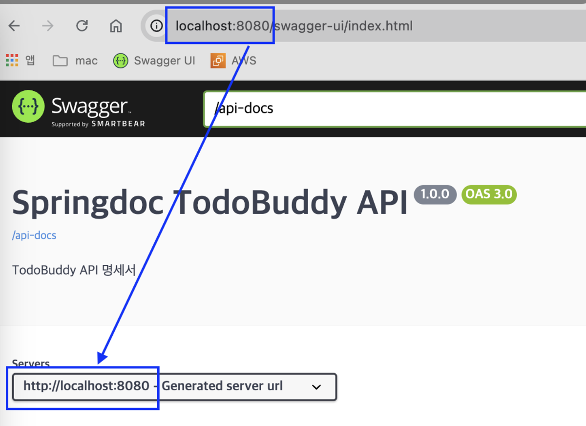 Server 정보를 추가하지 않는다면, 기본적으로 Swagger는 요청 도메인과 서버 도메인을 동일하게 사용한다. 아래처럼 요청 도메인이 http://localhost:8080인 경우, API 요청 또한 http://localhost:8080 보내진다.