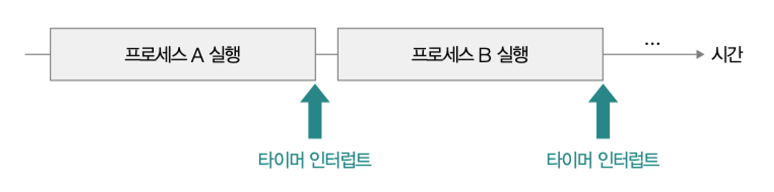 - 프로세스 A가 CPU 자원을 사용하다가 타이머 인터럽트가 발생하여 사용하던 CPU 자원을 반환한다.