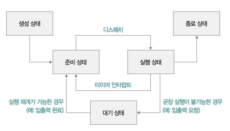 프로세스가 CPU 자원을 사용하기 위해서는 여러 단계를 거쳐야 한다. 여러 단계란 생성, 준비, 실행, 대기, 종료 상태를 의미한다.