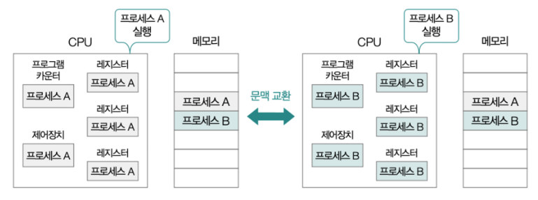 프로세스 A가 CPU 자원을 반납하였을 때, 프로세스 B가 CPU 스케줄링에 의해 CPU 자원을 할당받게 된다. 이때, 프로세스 A의 문맥을 PCB에 저장하고 프로세스 B는 이전에 했던 작업을 이어서 하기 위해 문맥을 가져와야 한다. CPU 자원을 사용하는 프로세스가 변경되면서 문맥을 저장하고 가져오는 행동을 문맥 교환(Context Switching)이라고 한다. 문맥 교환이 자주 일어나면 다양한 프로세스가 한정된 CPU 자원을 번갈아가면서 사용하기 때문에 좋을 것이라 생각할 수 있다. 그러나 너무 잦은 문맥 교환은 캐시 미스가 발생할 가능성이 높기 때문에 큰 오버헤드로 이어질 수 있다.