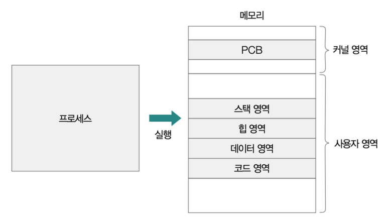 커널 영역에는 프로세스 제어 블록(PCB)이 저장되고, 사용자 영역에는 실행 중인 프로세스를 코드 영역, 데이터 영역, 힙 영역, 스택 영역으로 나뉘어 저장된다.