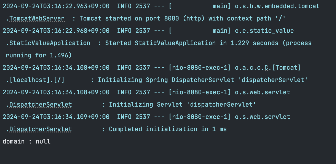 GET /test를 호출한 결과 domain 필드에 값을 주입받지 못하고 null이 저장된 것을 확인할 수 있다.