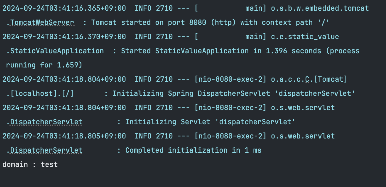 GET /test를 호출한 결과 domain 필드에 값을 주입받지 못하고 null이 저장된 것을 확인할 수 있다.