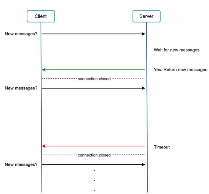 클라이언트는 HTTP 요청을 통해 서버에 데이터를 요청한다. 이때, Short Polling과는 달리 Long Polling에서는 서버가 즉시 응답을 내려주지 않는다. 클라이언트와 서버가 TCP 연결을 맺은 상태에서 서버에서 이벤트가 발생할 때까지 기다린다. 서버에서 이벤트가 발생하면 이미 맺어진 TCP 연결을 통해 즉시 응답을 내려줄 수 있다. 그러나 Long Polling 방식은 클라이언트와 서버가 TCP 연결 상태를 유지하기 때문에, 서버로부터 응답을 받을 때까지 연결이 지속된다. 서버가 응답을 내려주거나 연결 시간 초과(timeout)이 발생할 때까지 연결이 끊어지지 않는다.