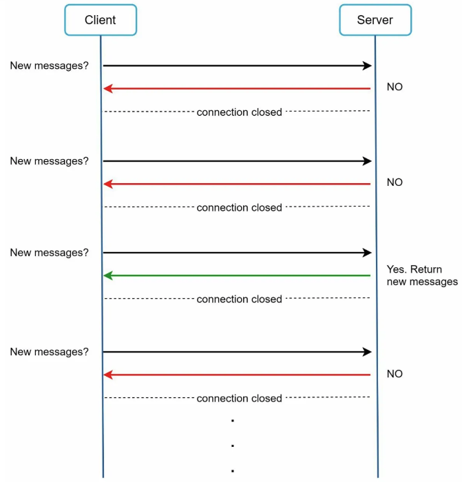 Short Polling 방식은 클라이언트에서 서버로 주기적인 요청을 보내는 것이다. 예를 들면, 클라이언트가 30초 간격으로 요청을 보내어 서버로부터 응답을 받는다. 그러나 한 가지 문제점이 있다면 서버가 내려줄 응답이 없음에도 클라이언트는 계속 요청을 보낸다는 것이다. 또한 서버에서 이벤트가 발생하였을 때, 실시간으로 응답을 내려주는 것이 아니라 클라이언트에서 요청을 해야 응답을 내려준다.