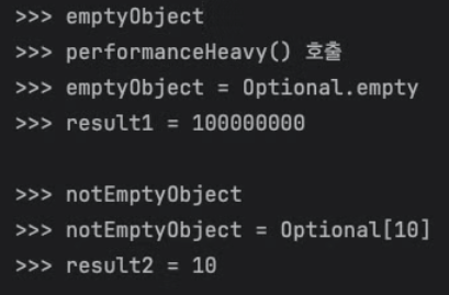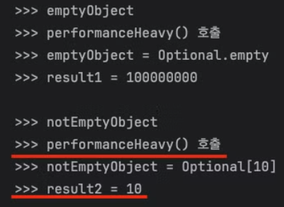 - notEmptyObject의 경우 Optional에 10이라는 데이터가 담겨있기 때문에 performanceHeavy() 를 호출하지 않는다.