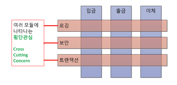 - 횡단 관심사(Cross-Cutting Concerns) : 비즈니스 로직과는 독립적인 기능