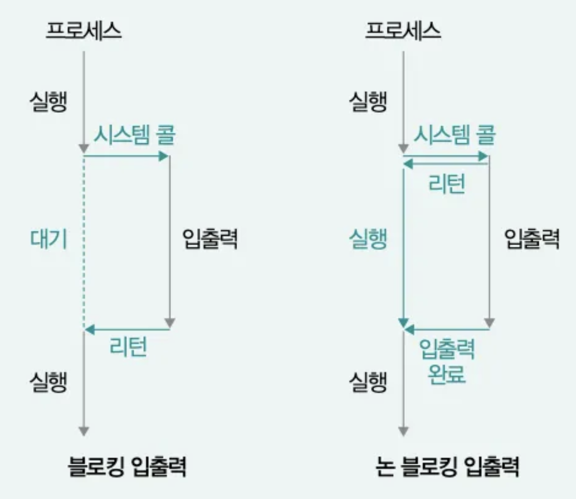 - 프로세스는 입출력 작업이 완료될 때까지 기다리지 않고, 입출력 장치에서 작업이 완료되면 신호를 발생시켜 프로세스에게 결과를 전달한다.
