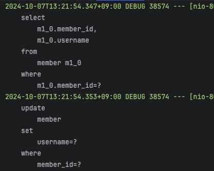 이후 updateUsername() 메서드를 통해 엔티티의 이름을 변경했지만, 트랜잭션 커밋 시점에 flush가 발생하지 않기 때문에 update 쿼리가 발생하지 않는 것을 확인할 수 있다. 이는 트랜잭션이 읽기 전용 상태에서 변경 작업이 무시되는 결과이다.
