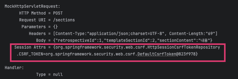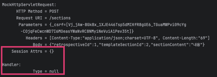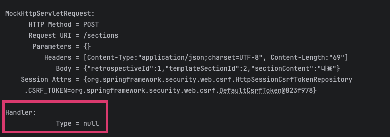 요청 헤더에 CSRF 토큰을 추가하니 이전과 달리 Session Attrs에 담긴 CSRF 토큰이 사라졌다. 요청 헤더에 담긴 CSRF 토큰과 서버 측 세션에 담긴 CSRF 토큰이 일치함에 따라 사라진 듯하다. 그러나 여전히 요청을 처리하는 Handler는 못 찾고 있는 듯하다.