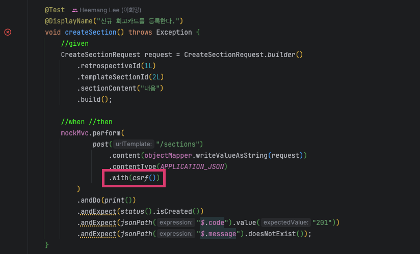 따라서 요청 헤더에 CSRF 토큰을 추가하기 위해 with(csrf())를 추가하였다. with(csrf())는 스프링 시큐리티가 자동으로 생성하는 CSRF 토큰을 요청 헤더에 추가하여 서버 측의 세션에 저장된 CSRF 토큰과 비교할 수 있도록 한다.