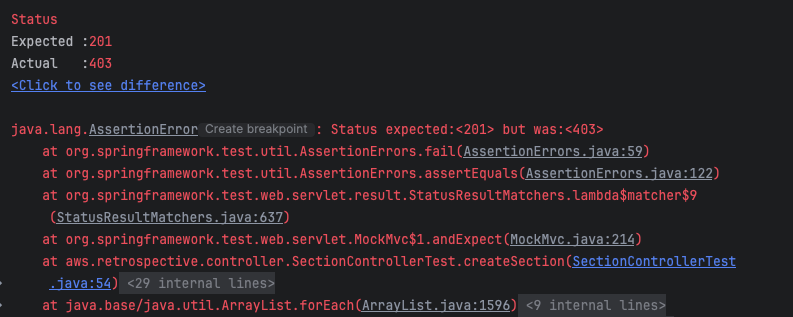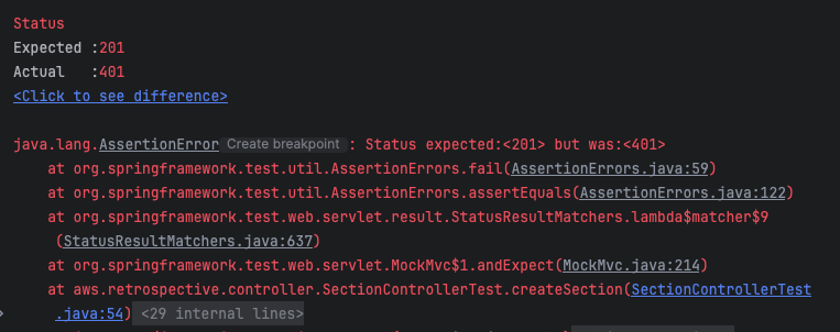 Presentation Layer 테스트 코드를 처음으로 작성한 필자는 당당하게 테스트 실행을 해보았다. 그러나.... 아래 사진과 같이 상태 코드로 201을 기대했지만, 실제로는 403을 반환한다. 내가 알고 있는 403 예외는 사용자가 인증은 되었으나, 권한이 없어 API 요청을 거절한 것으로 알고 있다.