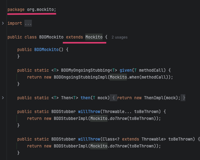 BDDMockito는 Mockito를 상속받아 BDD 스타일의 테스트 작성을 지원한다. BDDMockito는 Mockito와 동일한 기능을 제공하면서도 Given-When-Then 패턴을 직관적으로 사용할 수 있도록 설계되었다. 따라서 Mockito 기능을 기반으로 BDD 패턴에 맞는 표현을 사용하여 더 직관적인 테스트 코드 작성을 돕는다.