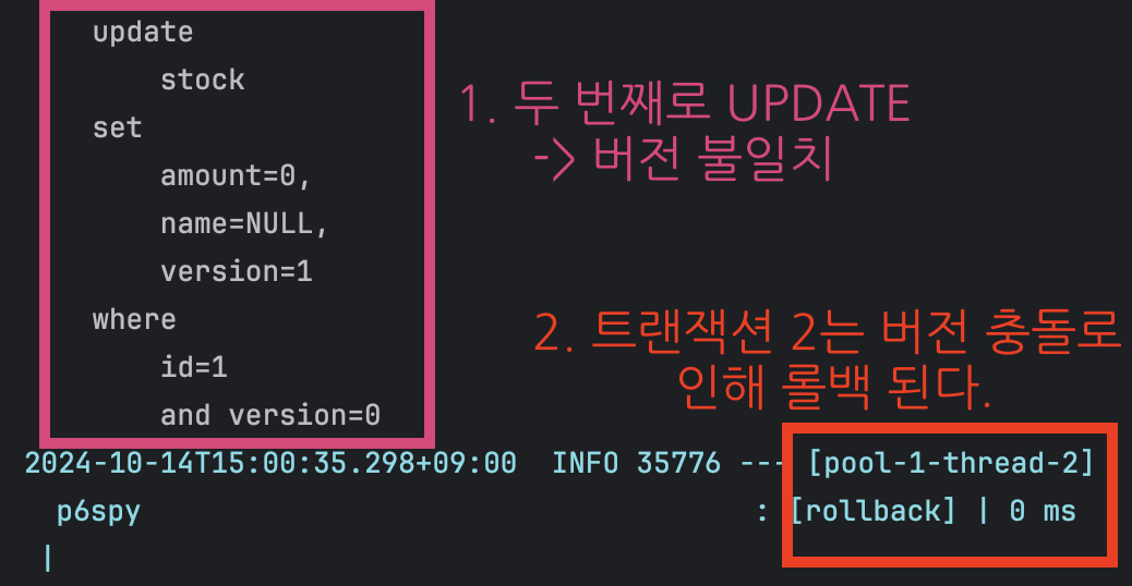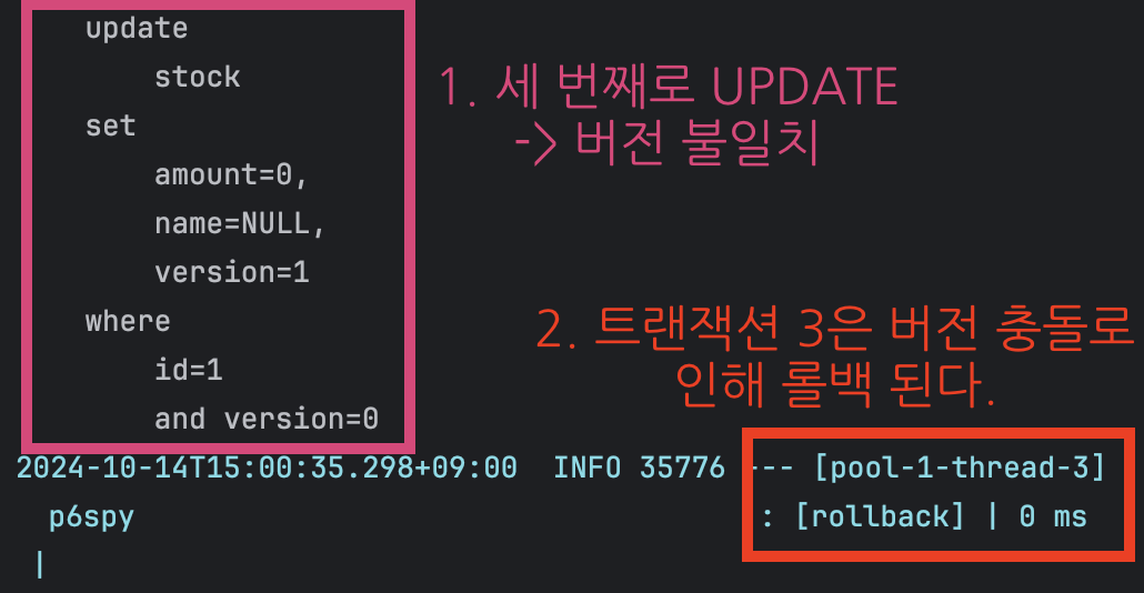 - 트랜잭션 1, 2, 3이 모두 동일한 버전 값을 가지고 있었는데, 트랜잭션 1이 UPDATE에 성공하면서 버전 값이 증가하였다. 따라서 트랜잭션 2와 3은 UPDATE 시점에 데이터베이스와 버전 값이 일치하지 않아 ROLLBACK이 발생한다.