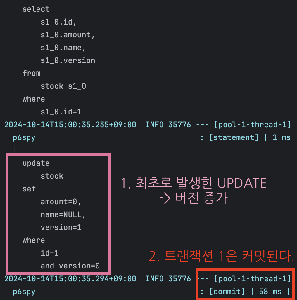 - 가장 먼저 엔티티를 수정하는 경우, 조회 시점의 버전과 데이터베이스의 버전이 일치하므로 트랜잭션 커밋이 된다.