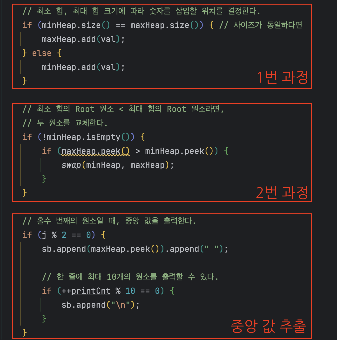 if (minHeap.size() == maxHeap.size()) { // 사이즈가 동일하다면