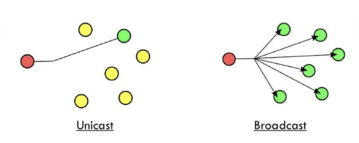 - 브로드캐스트 : IP 주소를 모르는 상태에서 동일한 네트워크의 모든 호스트에게 메시지를 전송하는 방법