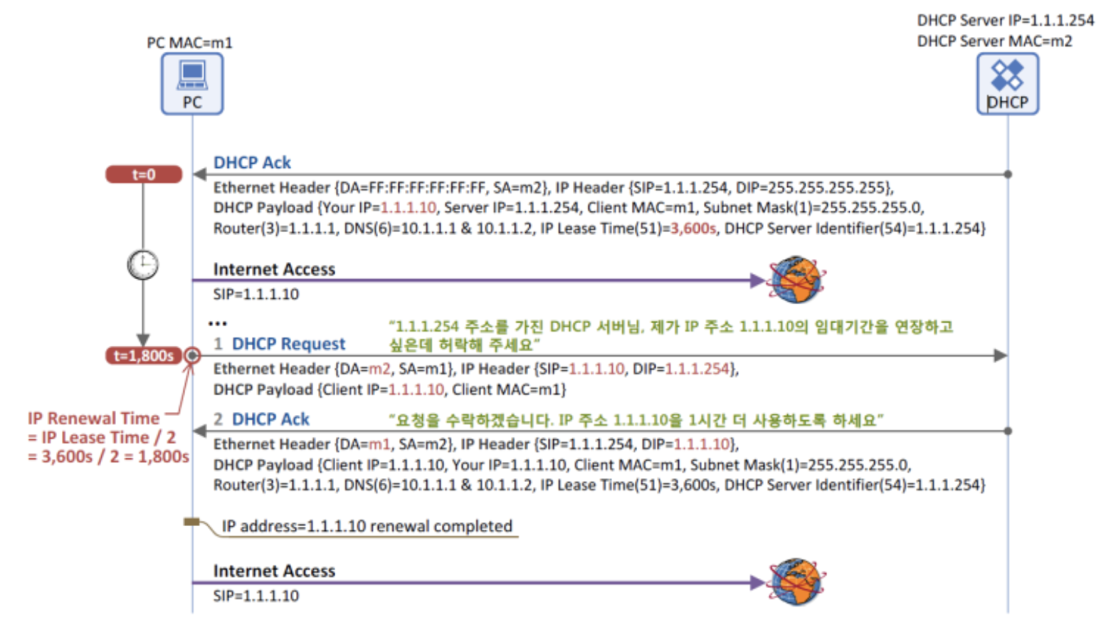 DHCP 설정 과정에서는 브로드캐스트 메시지를 전송하였으나, 갱신 과정에서는 유니캐스트를 사용한다. 클라이언트와 DHCP 서버 둘 다