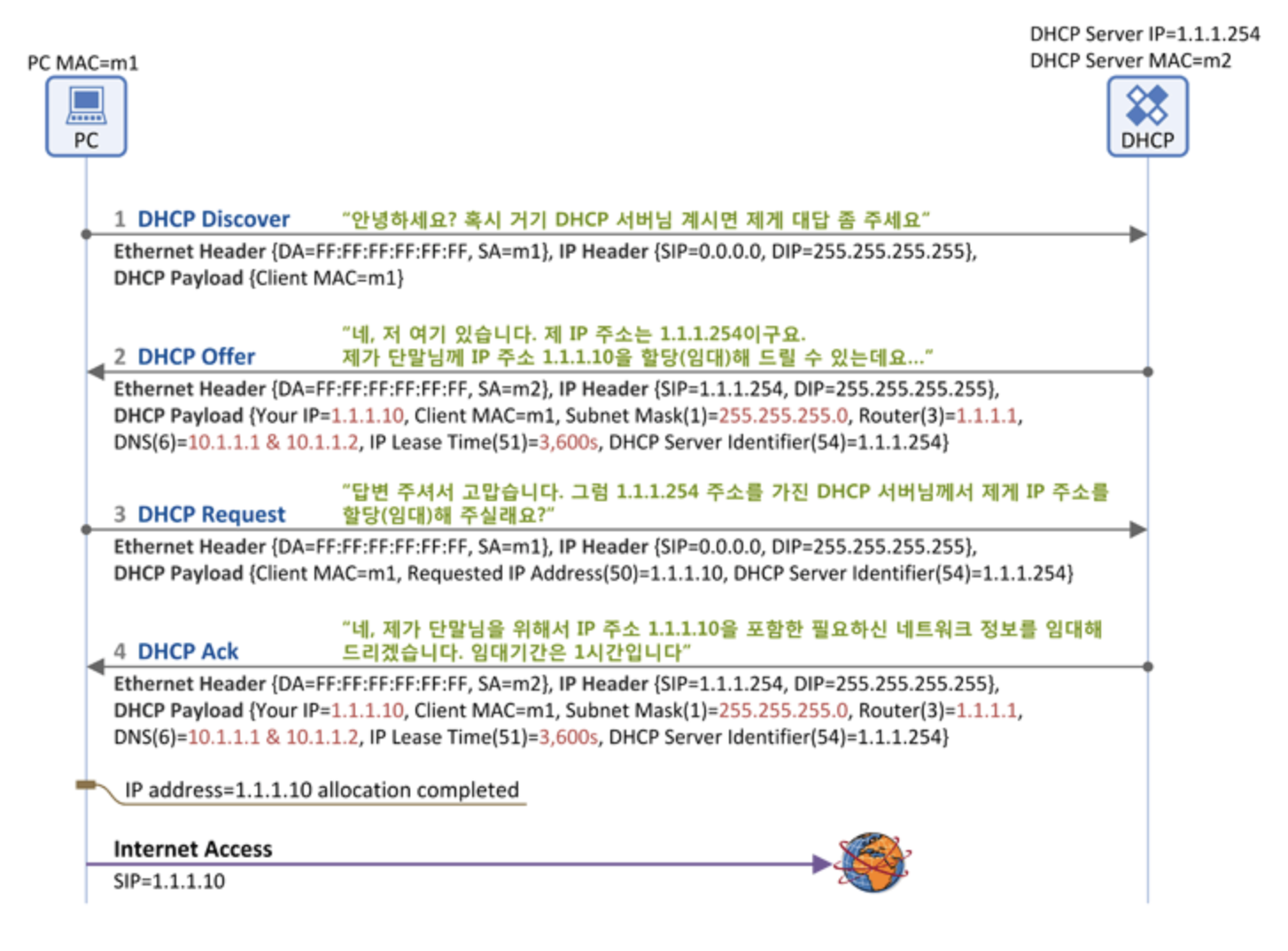 4가지 과정을 통해 클라이언트는 TCP/IP 통신을 위한 정보들을 제공받아 사용한다. 각 단계에서 클라이언트는 IP 주소가 할당된 상태가 아니기 때문에, DHCP 서버는 1:1 통신인 유니캐스트를 할 수 없다. 따라서 DHCP 서버는 브로드캐스트 메지시를 보내어 동일한 네트워크의 모든 호스트에게 사용 가능한 주소를 전송한다.