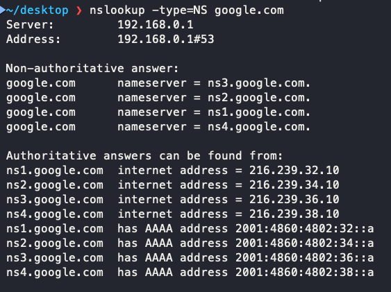 Authorative 네임 서버로부터 응답받기 위해서는 도메인을 직접 관리하는 Authorative 네임 서버를 조회해야 한다. 명령어 옵션으로 -type=NS를 추가하면 도메인을 직접 관리하는 Authorative 네임 서버가 조회된다. 아래 사진에서 ns1.google.com, ns2.google.com 등은 google.com 도메인의 실제 Authorative 네임 서버이다.