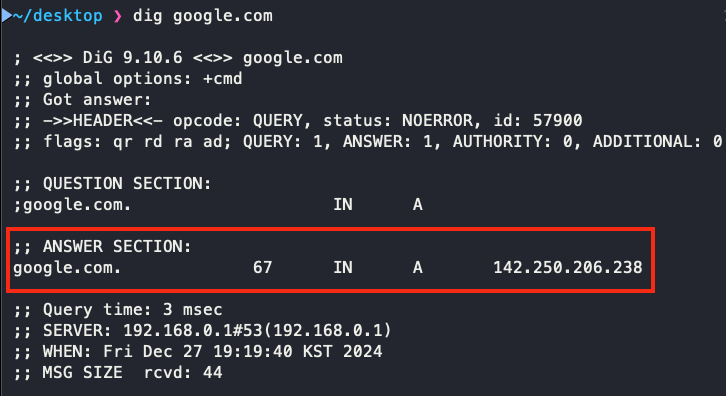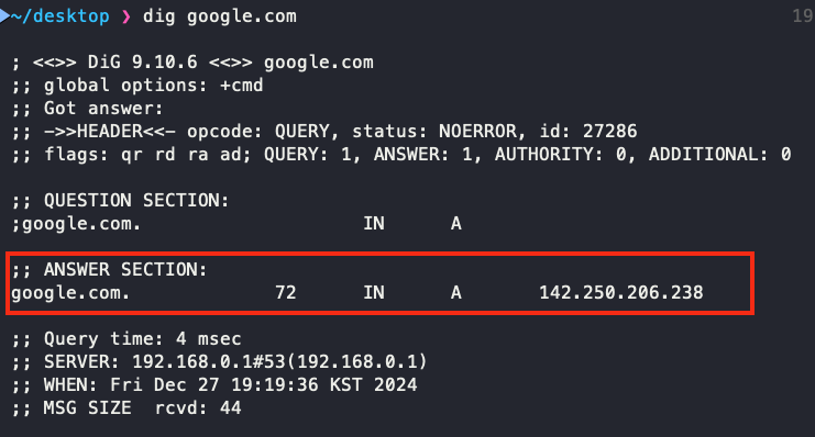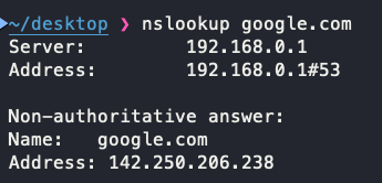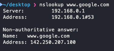 아래 사진의 경우 Non-authorative answer를 반환한다. 이는 로컬 DNS 서버(192.168.0.1)가 구글 네임 서버가 아니기 때문이다. 따라서 로컬 DNS 서버에 캐시되어 있는 IP 주소를 반환한다. 이는 이전에 google.com 도메인에 접속한 적이 있기 때문에 로컬 DNS 서버에 레코드가 캐시되어 있는 것이다.