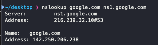 google.com 도메인을 관리하는 Authorative 네임 서버의 주소가 ns1.google.com 임을 확인했다. nslookup google.com ns1.google.com을 입력하면 Authorative 네임 서버로부터 직접 응답을 받을 수 있다.