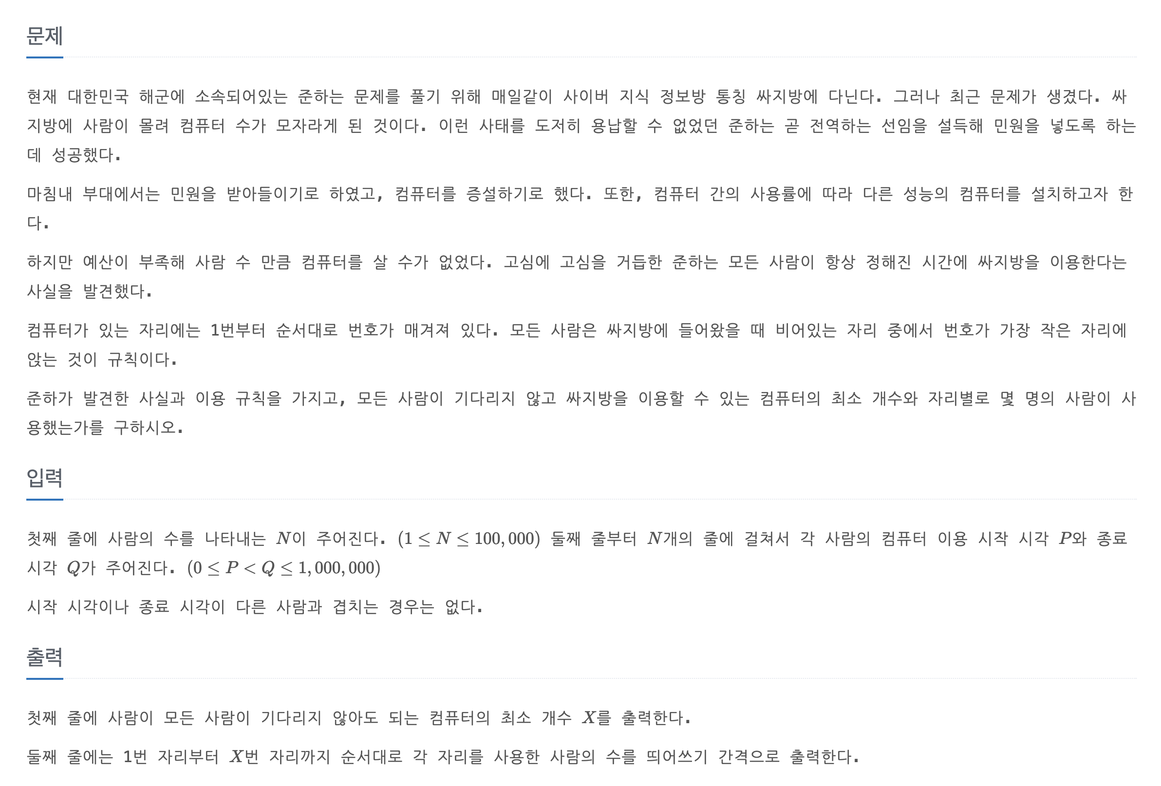 - times : N개의 (컴퓨터 사용 시간, 종료 시간)을 저장하되, 사용 시간이 빠른 순으로 저장한다. (우선순위 큐)