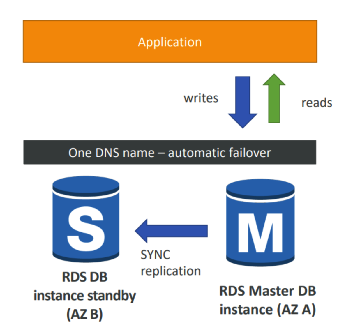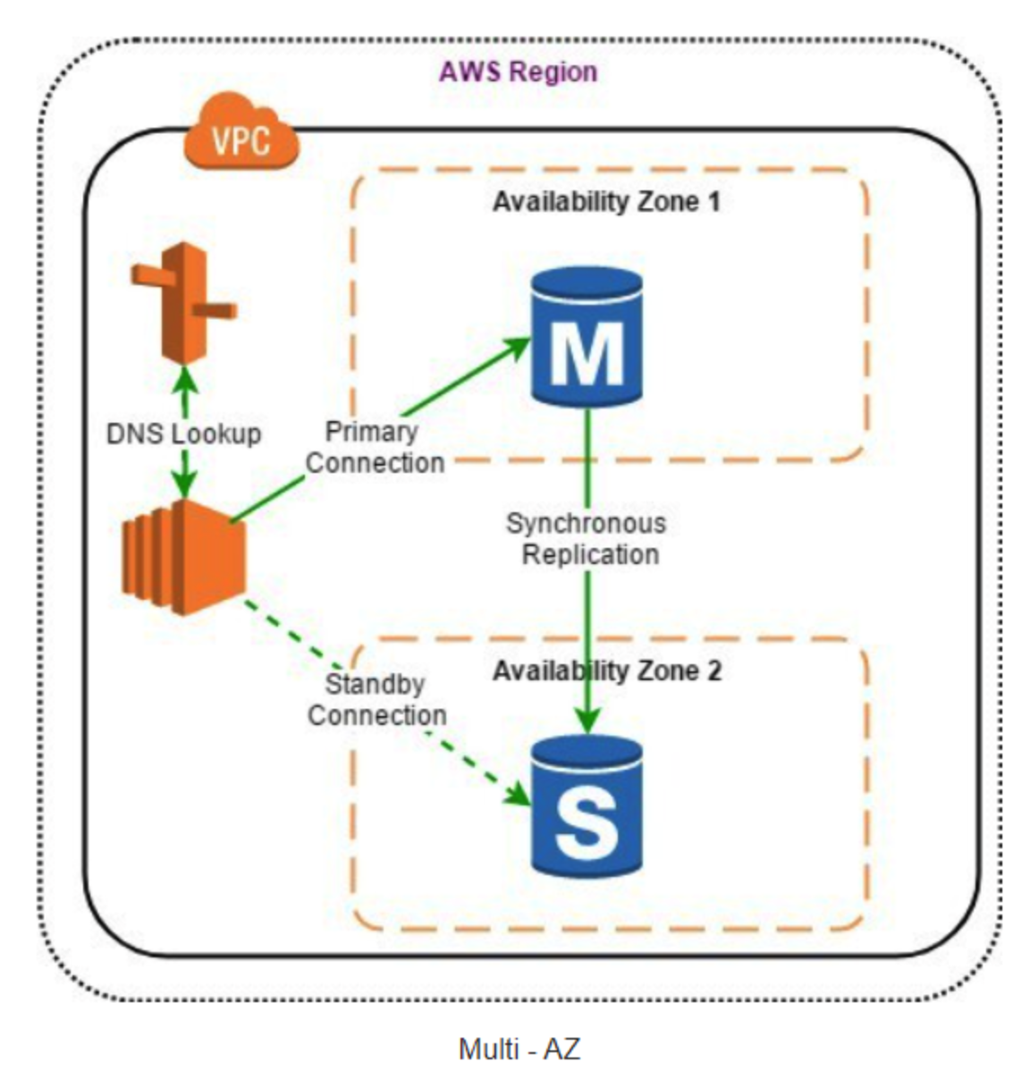 Amazon RDS는 다중 AZ 배포를 사용하여 데이터베이스 인스턴스의 고가용성을 제공합니다. 다중 AZ 배포에서는 기본 데이터베이스 인스턴스와 동기화된 보조 인스턴스가 다른 가용 영역(AZ)에 배치됩니다.