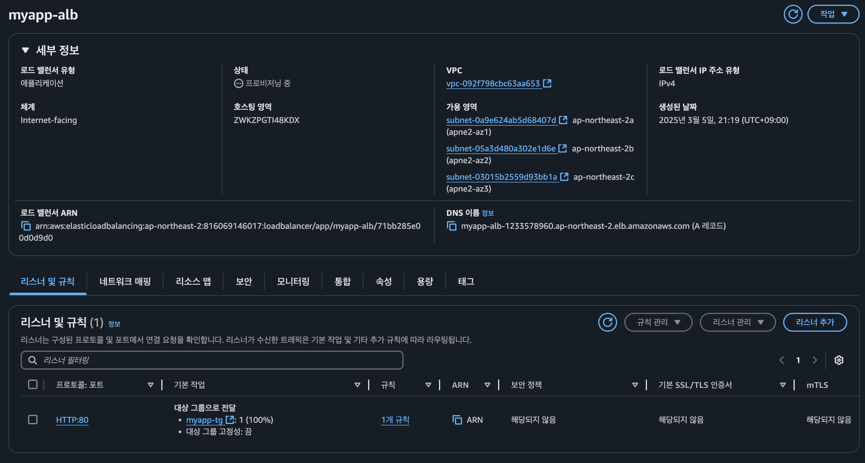 - myapp-alb의 경우 HTTP:80 트래픽을 수신하여 myapp-vpc에 속한 3개의 Public 서브넷으로 트래픽을 분산합니다.