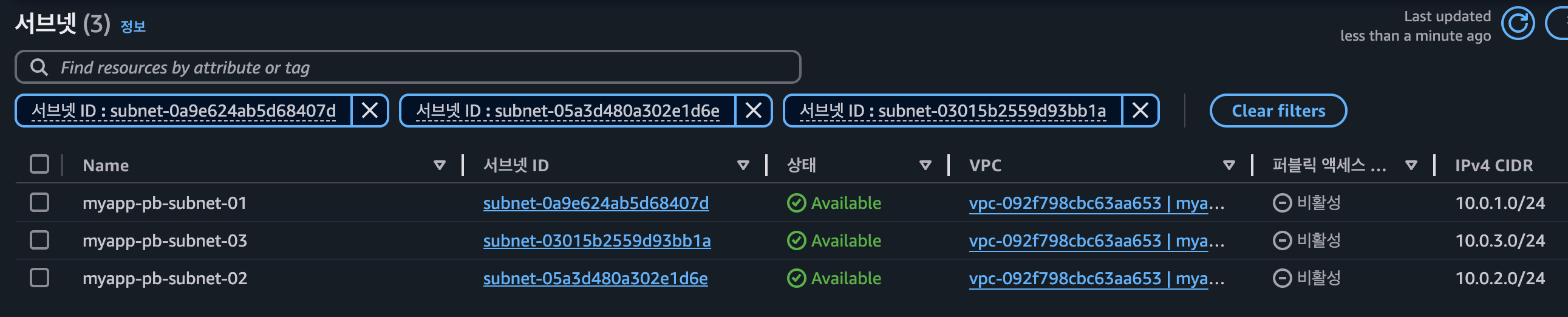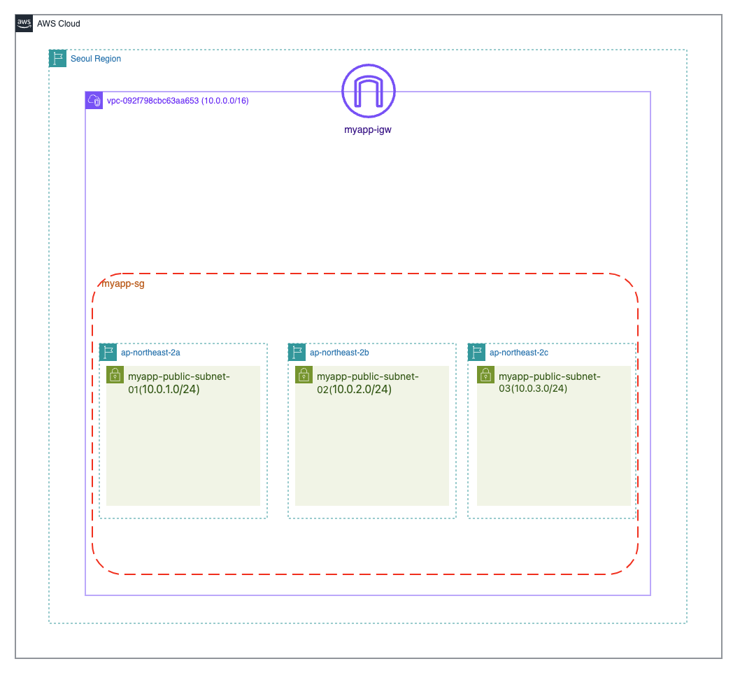 - 서브넷: myapp-public-subnet-01, myapp-public-subnet-02, myapp-public-subnet-03