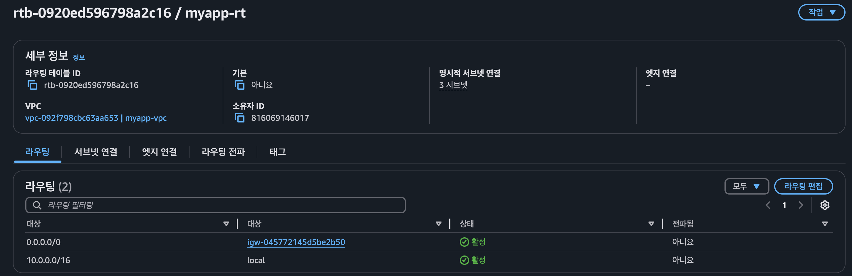 - 라우팅 설정: 0.0.0.0/0 -> myapp-igw