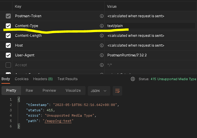 클라이언트에서 서버로 "hello"라는 text를 전송하였다. text의 경우에는 Media Type이 "text/plain"이다. 그러나 서버에서는 "application/json"에 한하여 처리를 가능할 수 있도록 설정했기 때문에 415 에러가 발생하는 것이다.