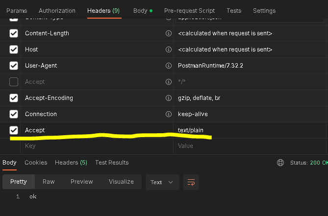 아래는 정상적으로 처리된 경우이다. produces = "text/plain"으로 클라이언트가 요구하는 Media Type 제한을 걸었고, Accept 헤더를 "text/plain"으로 응답하였기 때문에 클라이언트에서 정상적으로 응답을 받는 경우이다.