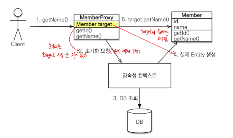 EntityManager의 getReference() 메서드를 사용하여 프록시 객체를 조회합니다. 프록시 객체란 실제 엔티티 대신에 DB 조회를 지연할 수 있는 가짜 객체를 의미합니다. 프록시 객체는 실제로 사용될 때 DB를 조회하여 실제 엔티티 객체를 생성합니다. (이를 프록시 객체의 초기화라고 합니다)